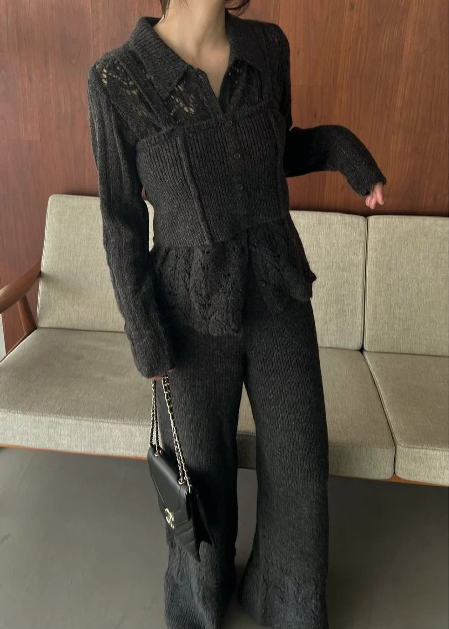 sheer crochet collar knit piping bustier set