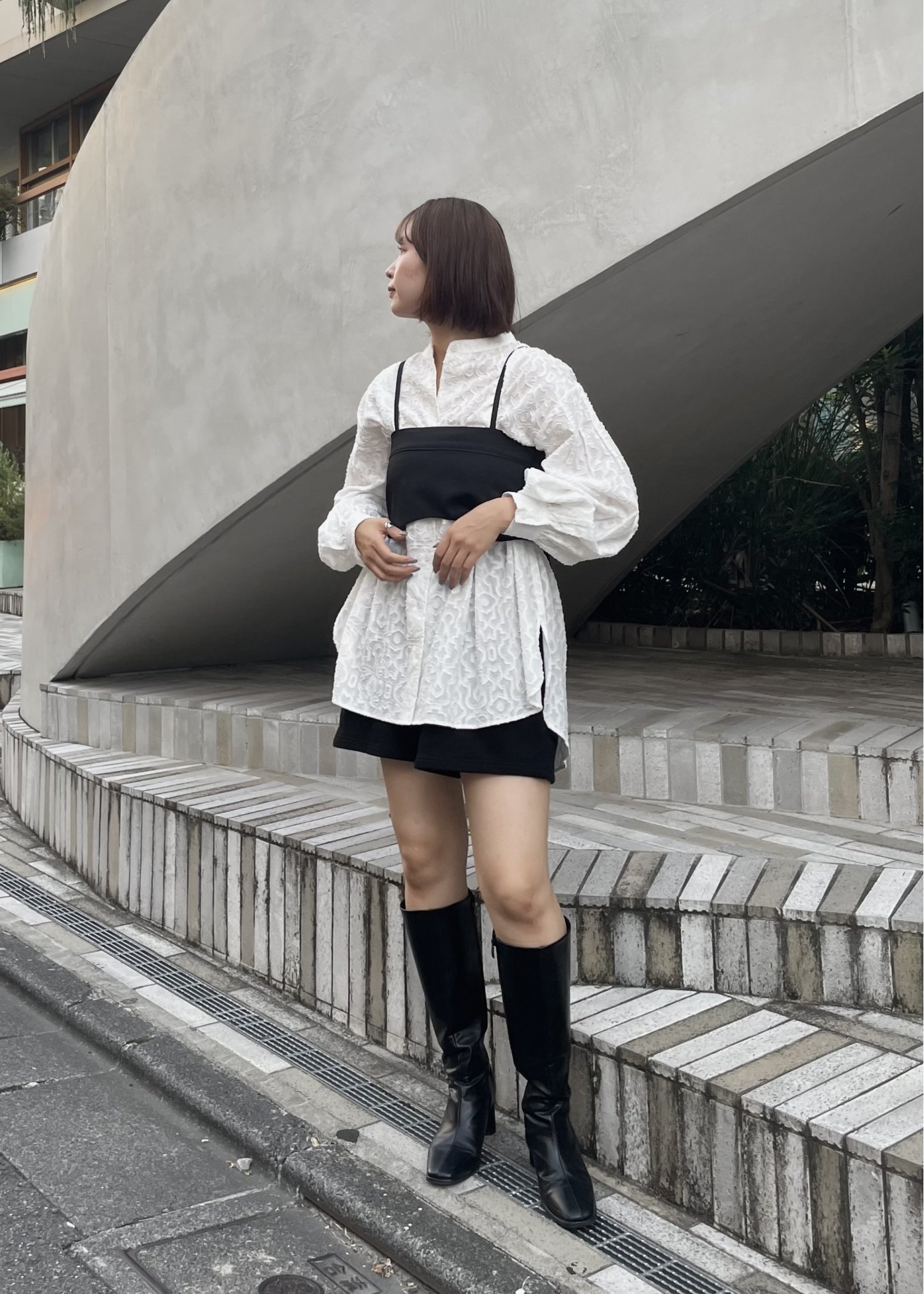 band collar round tuck flare shirt