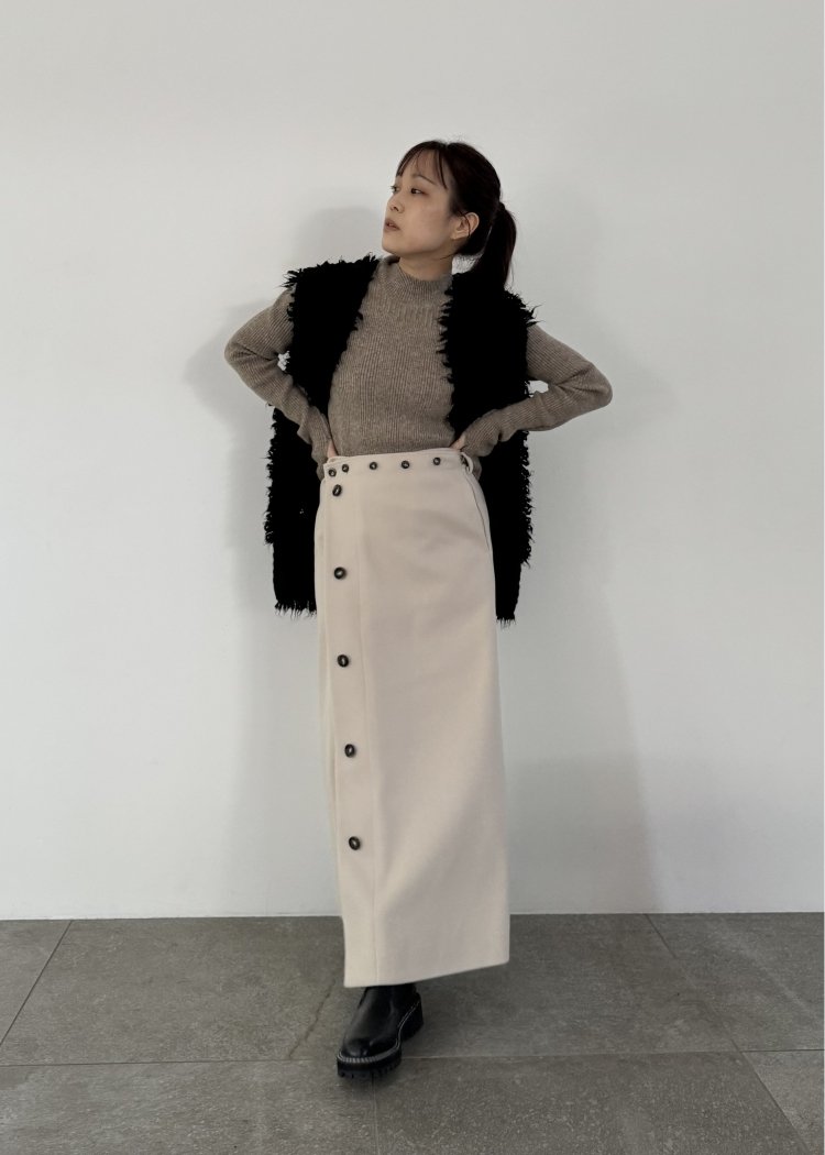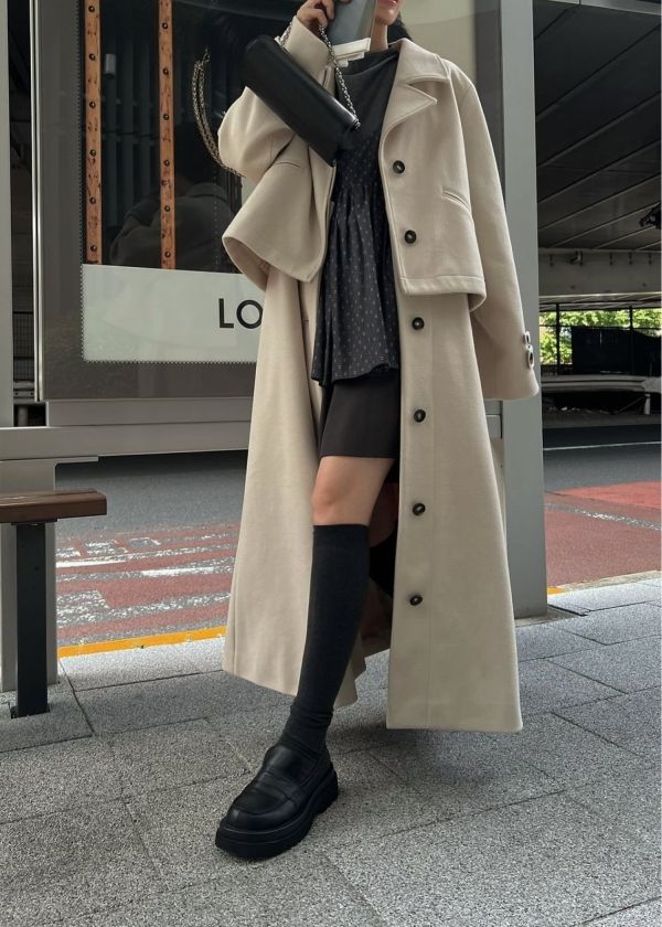 裾のボタンを外しブーツを覗かせるスタイリングもおすすめ