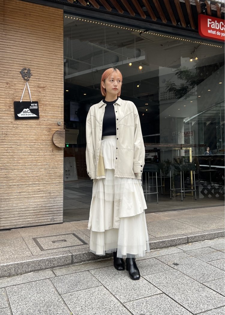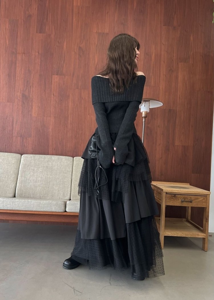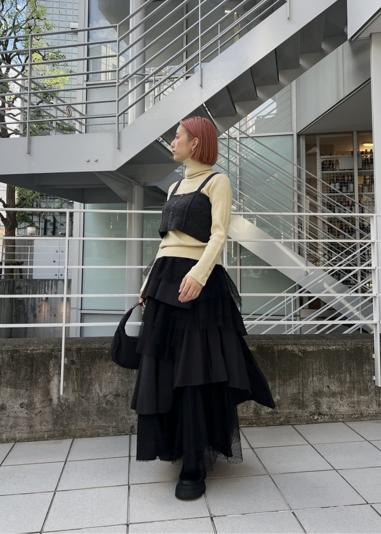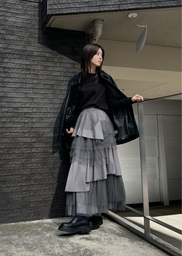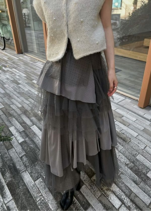・2種類の素材をランダムに何重にも重ねたティアードスカート