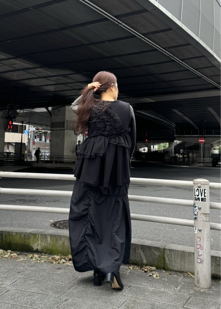 ・ギャザーやシャーリングを不規則に走らせ、表情豊かなデザインに