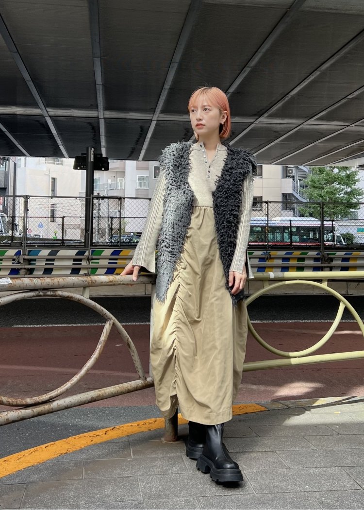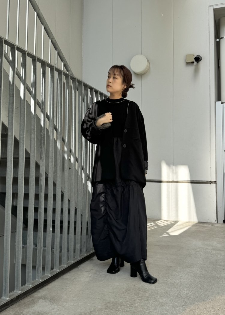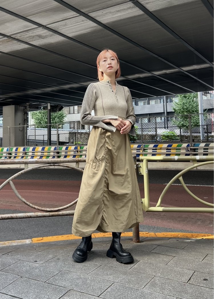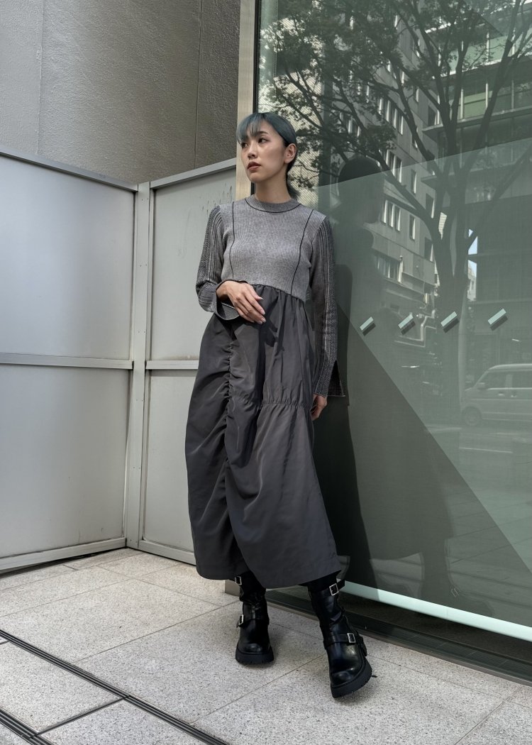 ・ジャカードニットとナイロンスカートのドッキングワンピース