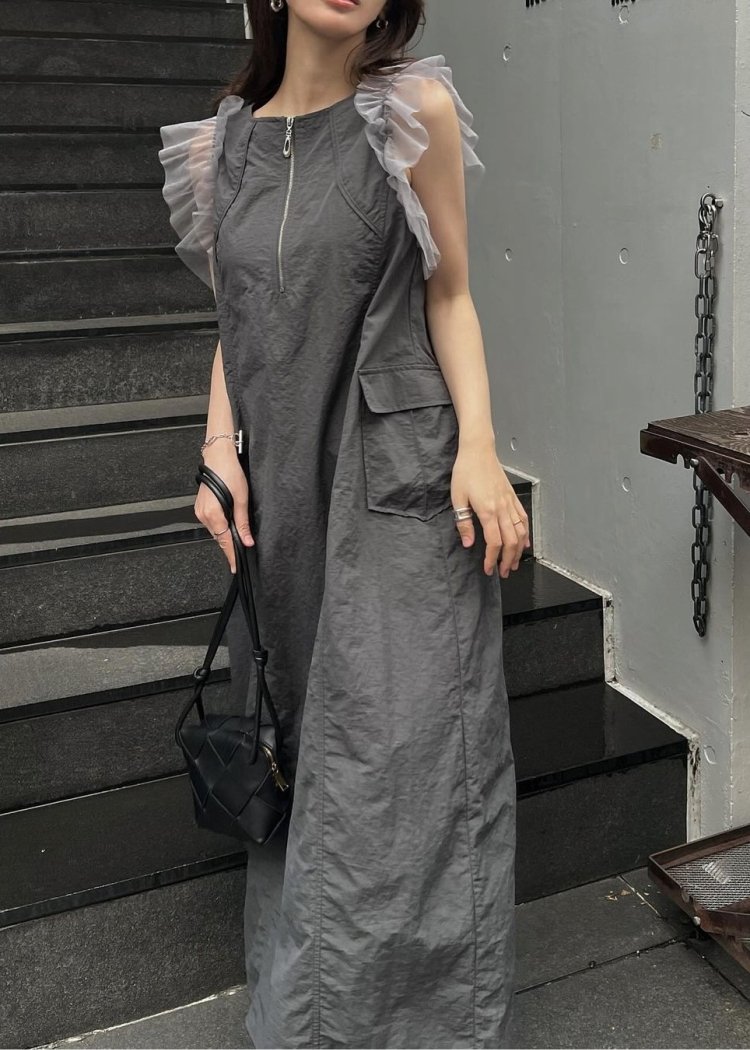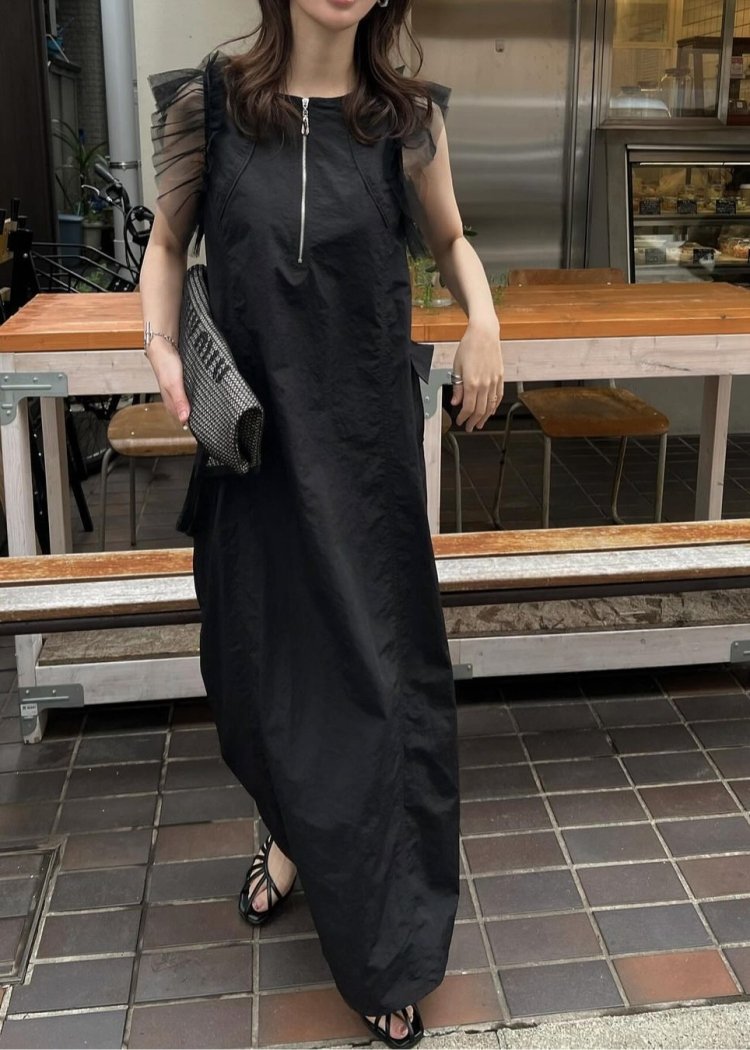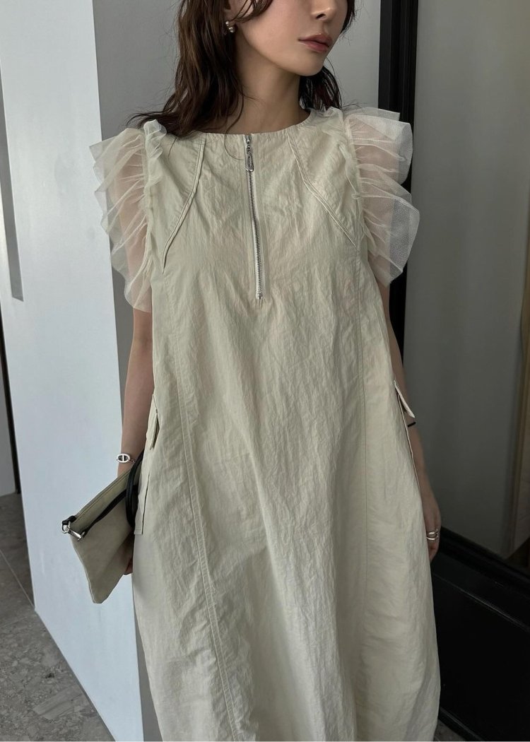 ・ソフトチュールフリル袖を縫い付けたハーフジップワンピース