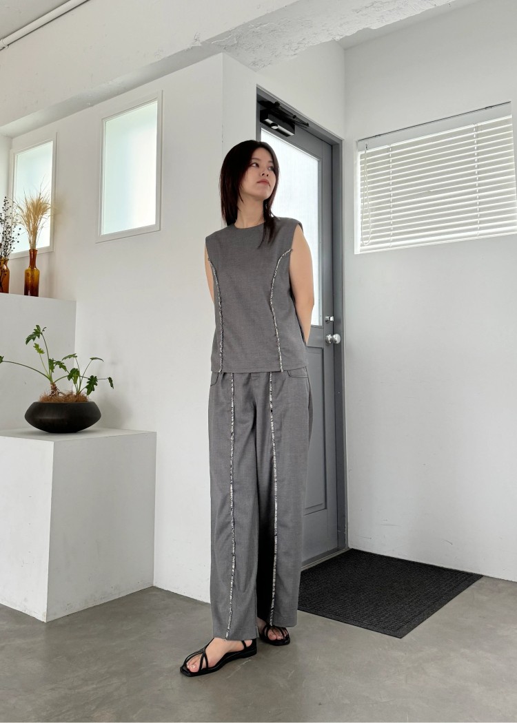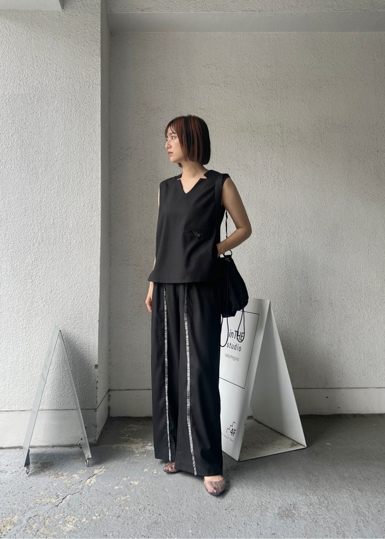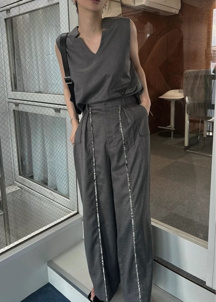 ・センターラインにフリンジテープを挟み込んだタックパンツ